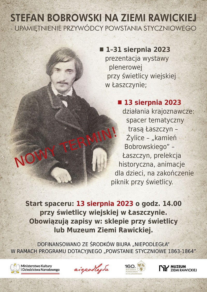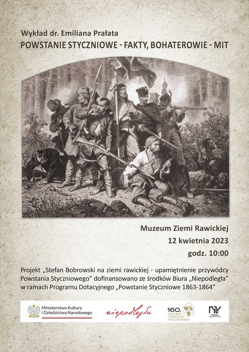Muzeum Ziemi Rawickiej w ramach projektu pn. „Stefan Bobrowski na ziemi rawickiej – upamiętnienie przywódcy Powstania Styczniowego” zaprasza do udziału w prelekcji dr. Emiliana Prałata "POWSTANIE STYCZNIOWE - fakty, bohaterowie-mit". 12 kwietnia o godz. 10.00.